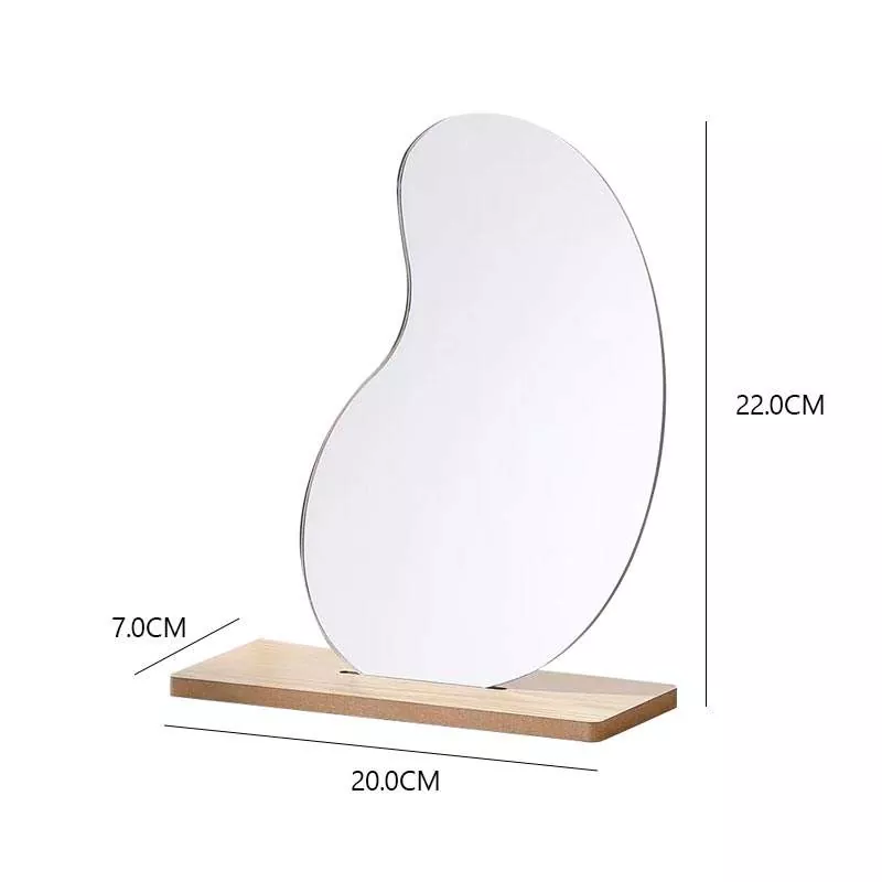 Šis netaisyklingas banguotas stalviršio veidrodis pasižymi minimalistiniu, menišku siluetu, kuris sklandžiai dera su šiuolaikišku namų dekoru. Sukurtas iš didelės raiškos skaidraus stiklo ir lygaus medinio pagrindo, jis atspindi be iškraipymų, idealiai tinka makiažui, odos priežiūrai ir kasdienei priežiūrai.